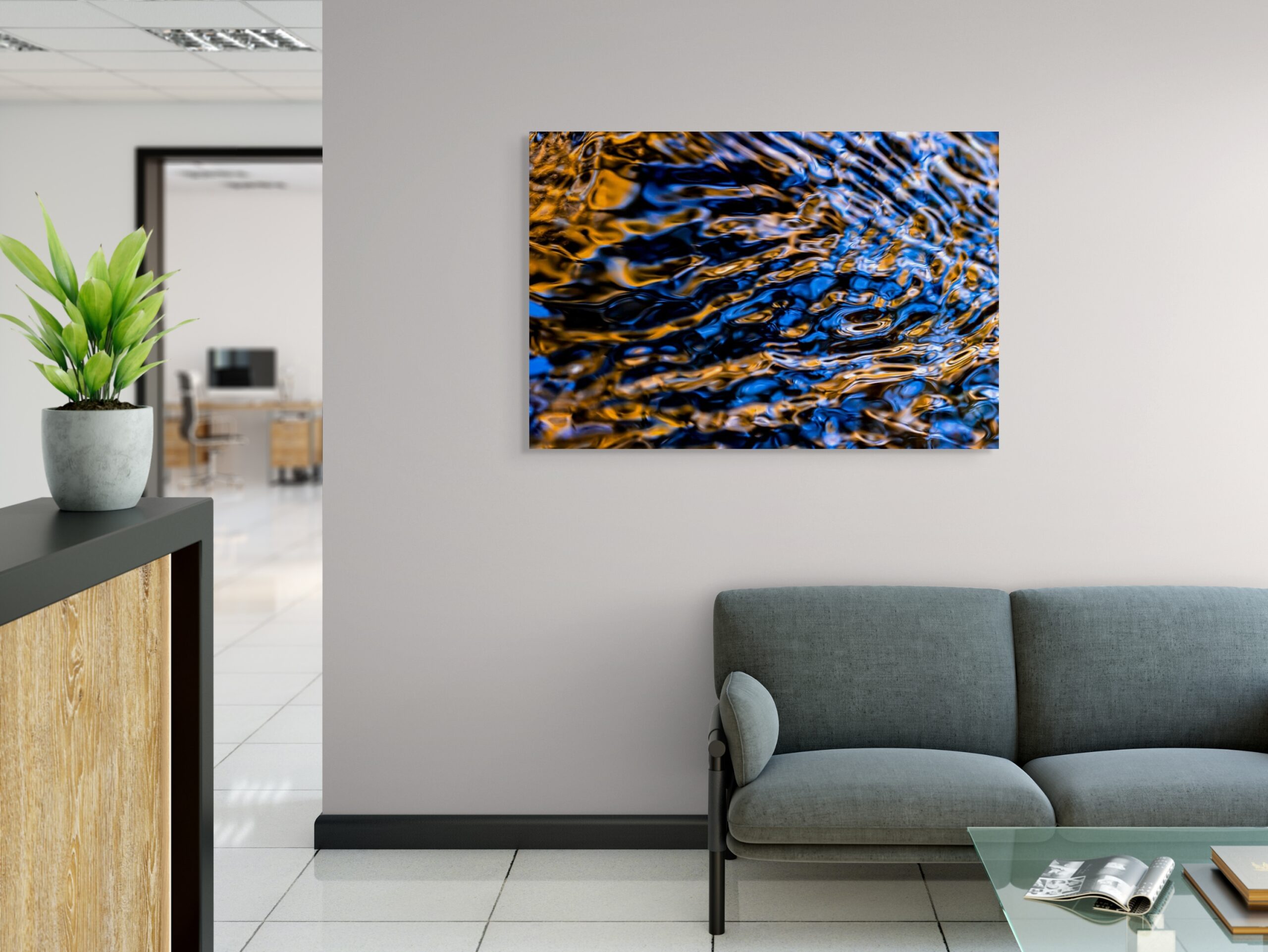 This serene photograph captures the gentle blending of soothing oranges and calming blues, creating a tranquil scene reminiscent of a peaceful sunset reflected on the water.